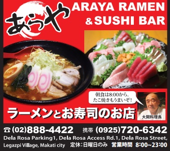 美味しいラーメンを毎日食べたいというわがままな日本人がデラロサ通りに開いた店。価格はP220〜500。体にやさしい鶏がらスープがベースの本格的北海道ラーメン。わずか20席ながら多い日には100杯売れるという。グリーンベルトモールとMMCを繋ぐ高架歩道のほぼ中央、駐車場ビルの1階なので徒歩でも車でも便利。