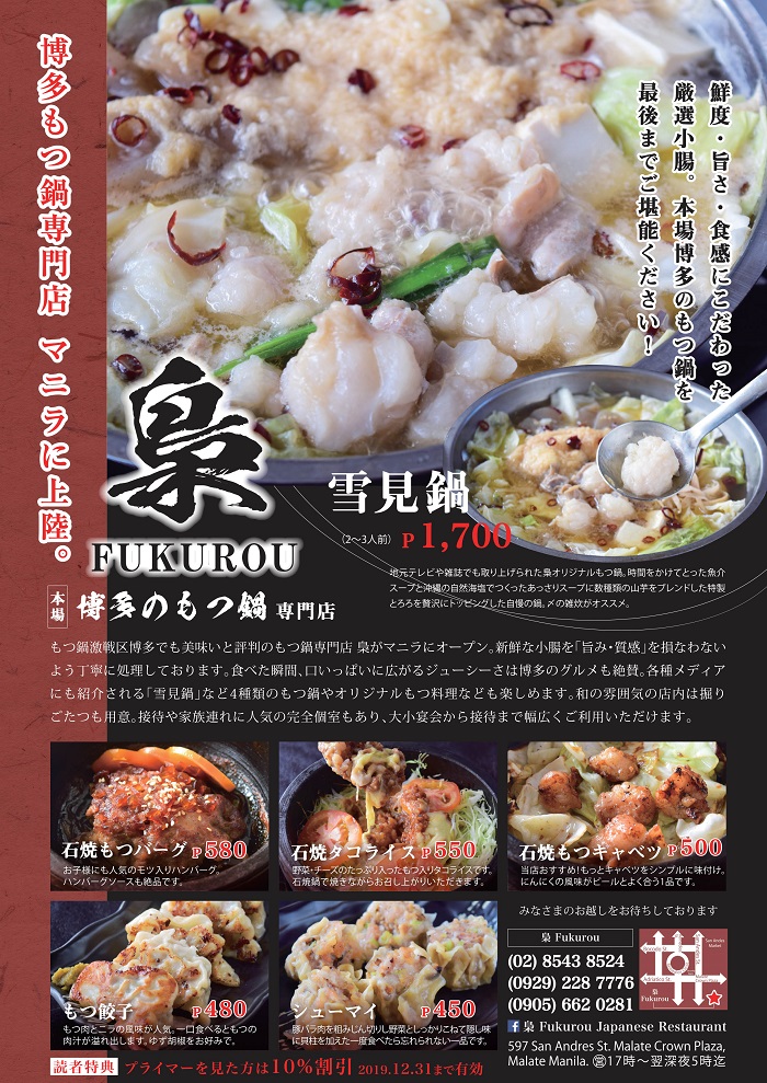 【FUKUROU 梟は閉店しました】もつ鍋激戦区博多でも美味しいと評判のもつ鍋専門店 梟がマニラにオープン。新鮮な小腸を「旨み・質感」を損なわないよう丁寧に処理しております。食べた瞬間、口いっぱいに広がるジューシーさは博多のグルメも絶賛。