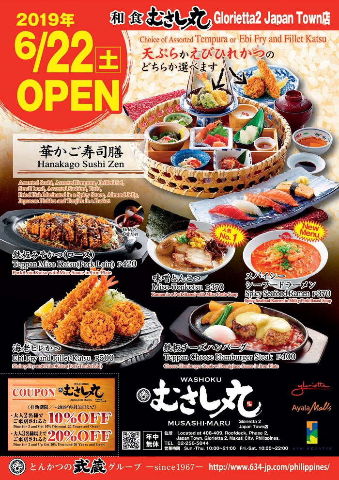 2024年4月22日にOne Ayala Mallにお店「むさし亭」をオープン!おすすめは日本国内で展開する「まるとん本舗」で提供するラーメンにとんかつメニューなど多数揃えています。グロリエッタ店の「むさし丸」では数多くの和食メニューを揃え、とんかつ、ラーメン、寿司、一品物も多数揃えており、日本人にもフィリピン人にも人気店。