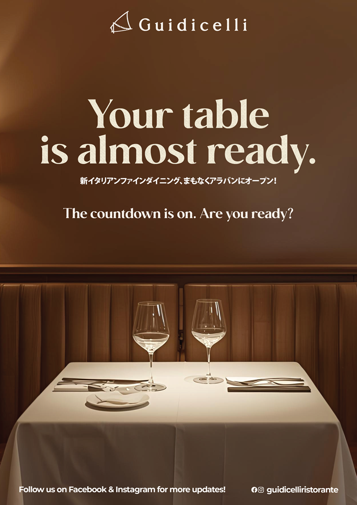- 【アラバン】Get ready for authentic flavors. Refined ambiance. A new chapter in Italian dining is almost here. 本格的な味わいと洗練された空間をお楽しみに。イタリアンダイニングの新たな幕開けが、もうすぐ始まります。