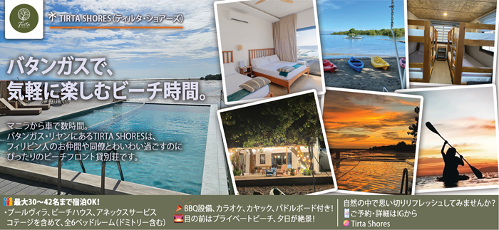 - 【バタンガス】バタンガスで、気軽に楽しむビーチ時間。マニラから車で数時間。バタンガス・リヤンにあるTIRTA SHORESは、フィリピン人のお仲間や同僚とわいわい過ごすのにぴったりのビーチフロント貸別荘です。