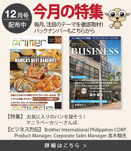 - 今月号の特集は、マニラのベーカリー。トラベル特集では、「ボラカイ BORACAY」 をピックアップ。ビジネス烈伝では、Brother Philippinesの高木駿氏 にインタビュー。ビジネス特集では、前回に引き続き「業界別企業紹介 金属加工②」 を掲載しています。