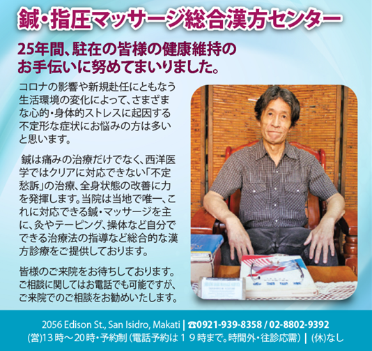 マッサージは慰安、娯楽ではありません。漢方医療の一部です。漢方医学の日本人専門家に、日本語で体調の不安を相談し、心身両面のストレス、不具合の相談・解決ができる日本式鍼灸・指圧マッサージ、操体、漢方相談等、フィリピン唯一の漢方クリニックとして皆様のお役に立ちたいと願っております。