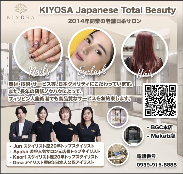 BGC・Makatiで人気の日系サロンKIYOSA。日本人スタッフ常駐でネイル・ヘア・まつエク・ラッシュリフトを日本クオリティで提供します。 丁寧なカウンセリングと確かな施術で、多くの方に選ばれています。