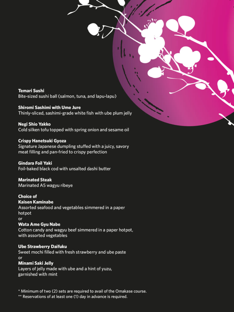 オルティガスの日本食レストラン・南咲では、ホリデーシーズンに向けて、1セット4,775ペソのおまかせコースをご用意しています。コース内容は、季節感あふれる洗練された料理で構成されており、一口サイズの手まり寿司や刺身から、A5和牛や鍋などの贅沢なメイン料理、そしてウベを使った上品なデザートまでお楽しみいただけます。予約制で、1回のご予約につき2セット以上から承ります。本プロモは2026年1月31日まで提供され、予約受付は1月30日までとなっています。