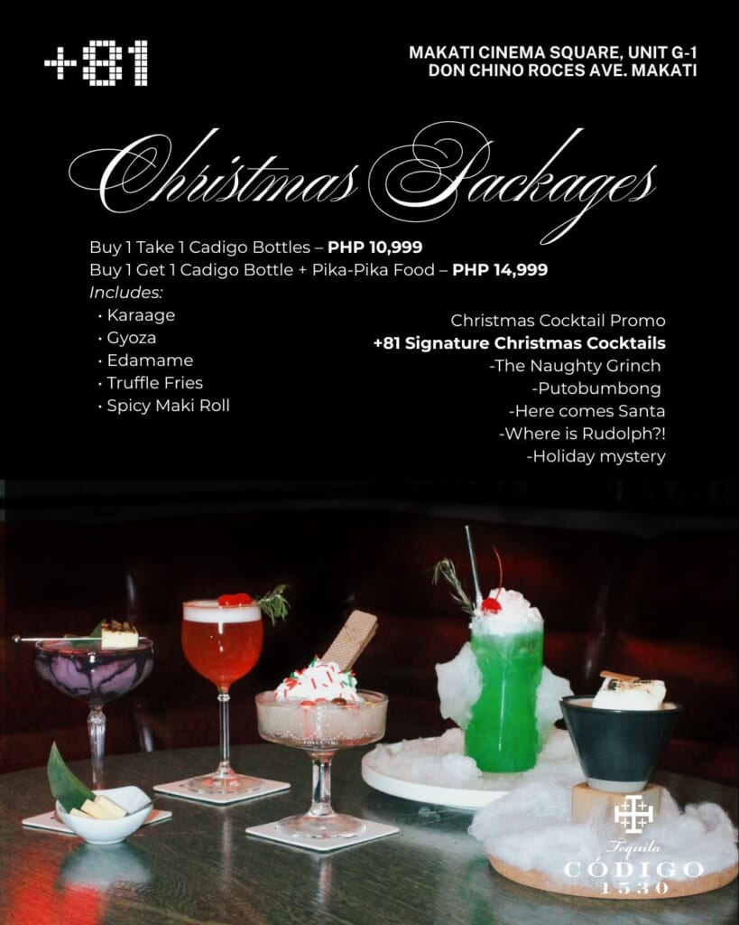 +81では、年末の集まりにぴったりなクリスマスパッケージでホリデームードを盛り上げます。CadigoボトルのBuy 1 Take 1(10,999ペソ)、またはCadigoボトルのBuy 1 Get 1に「Pika-Pika Food」付き(14,999ペソ)からお選びいただけます。「Pika-Pika Food」には、唐揚げ、餃子、枝豆、トリュフフライ、スパイシー巻き寿司など、人気メニューが揃います。さらに、ホリデーシーズン限定の+81シグネチャー・クリスマスカクテルも登場。「The Naughty Grinch」や「Here Comes Santa」など、遊び心あふれるカクテルが揃い、賑やかな夜を楽しむのに最適な一軒です。