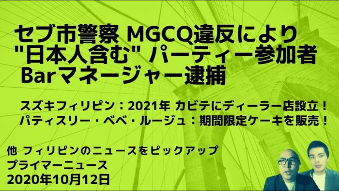 YouTubeプライマーチャンネルで最新の動画を公開しました!今回は「セブ市警察 MGCQ違反により "日本人含む" パーティー参加者・バーマネージャーを逮捕」巷で話題のフィリピンローカルニュースなど紹介します。