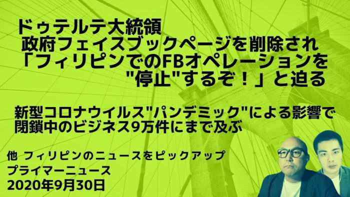 YouTubeプライマーチャンネルで最新の動画を公開しました!今回は「ドゥテルテ大統領、政府のフェイスブックページを削除されフィリピンでのFBオペレーションを停止すると迫る」巷で話題のフィリピンローカルニュースなど紹介します。