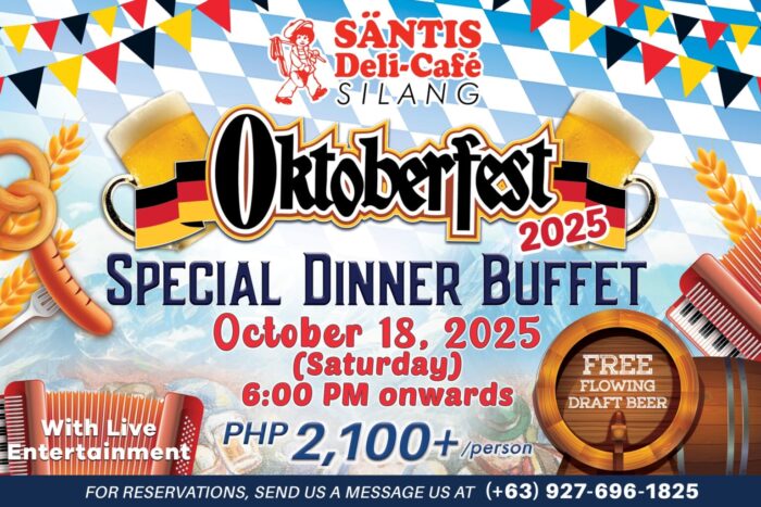 10月18日(土)午後6時より「Säntis Deli Café Silang」にて、オクトーバーフェストが開催されます。プレミアムなデリカテッセンやヨーロッパ食材で知られるSäntis Delicatessenが、この夜限りでシラン店のカフェを賑やかなビアホールに変え、特別なひとときをお届けします。