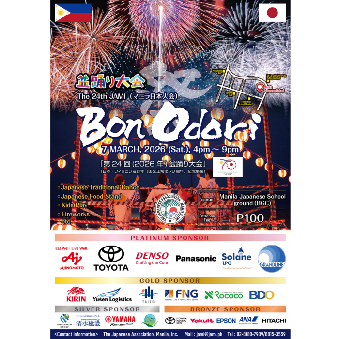3月7日(土)、マニラ日本人学校グラウンド(BGC)にて「第24回 Manila Japanese Association Bon Odori Festival(マニラ日本人盆踊り大会)」が開催されます。時間は午後4時~9時(荒天中止)。