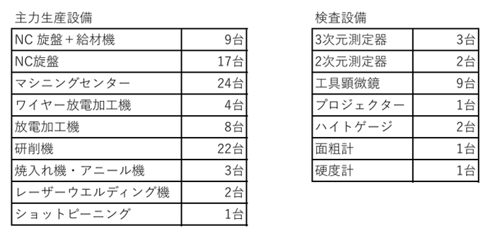 当社の主力設備は、全て日本製で下記のとおりです。お客様とのコミュニケーションを大切にし、フィリピンで最高品質の部品を提供致します。