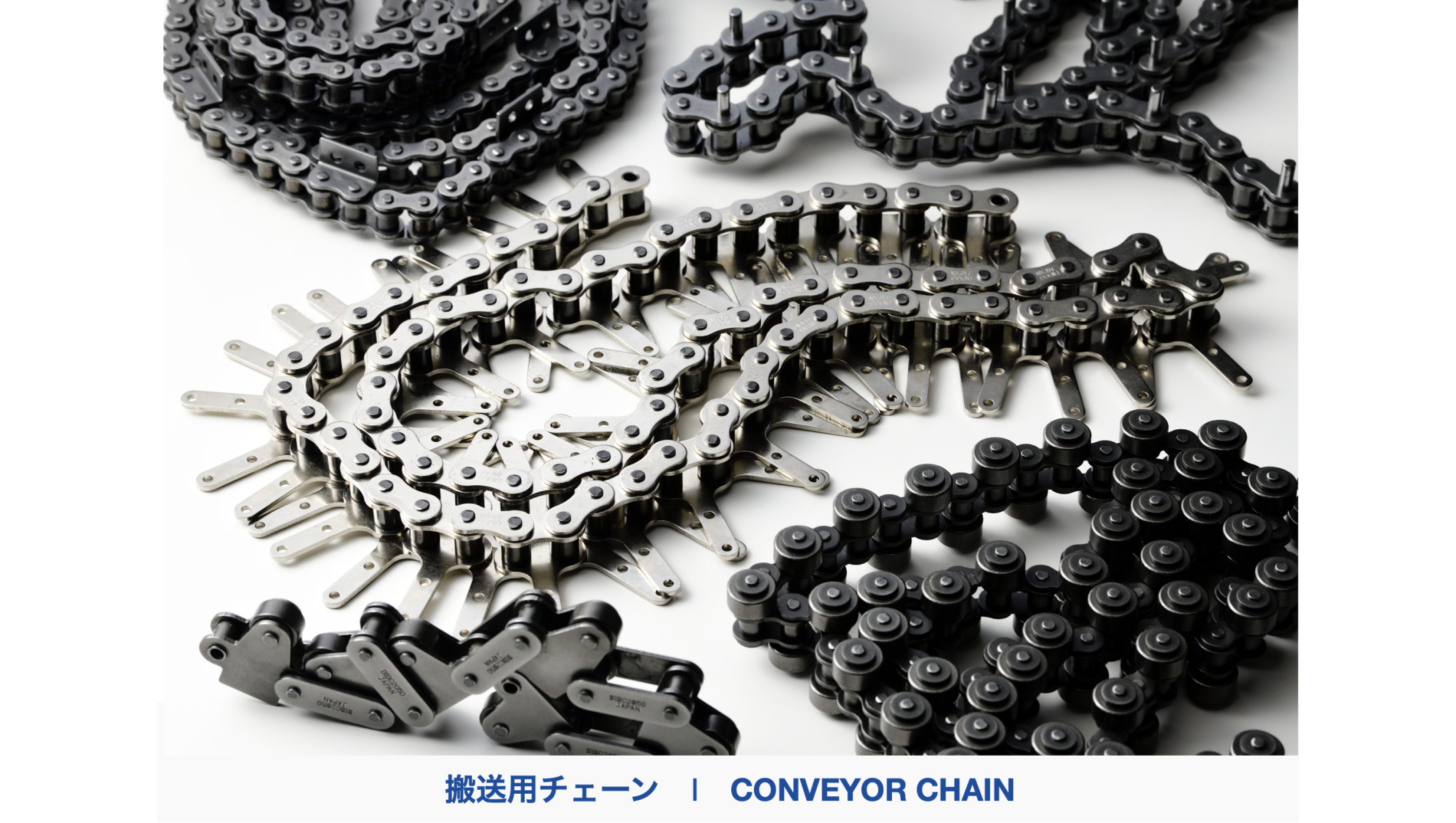 ものを搬送するために、プレートやピンを特殊形状にしたアタッチメントをとりつけたチェーンです。食品、化学、農機、搬送といった幅広い分野で用いられています。