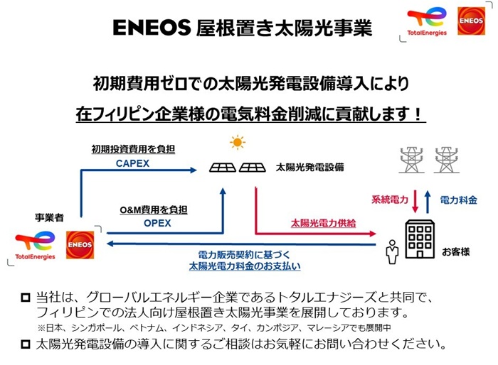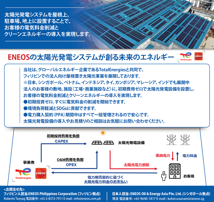 ENEOSはグローバルエネルギー企業であるトタルエナジーズとともに、フィリピンで法人向けの屋根置き太陽光発電(オンサイトPPA)を提供し、お客様の電気料金削減とCO2排出削減を支援しています。