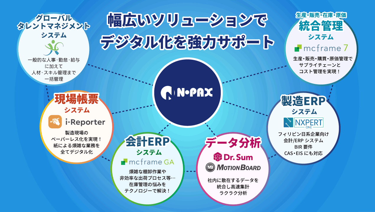 弊社N-PAXは、フィリピンにて設立以来20年以上の実績を持ち、パッケージシステムの提供を中心に、グローバルなシステム導入実績を強みとしております。フィリピン国内の3拠点にて、システムコンサルティングサービス、安定したシステム導入や運用サポートなども行っており、日系製造業をはじめとした幅広いお客様に高い満足を頂いております。