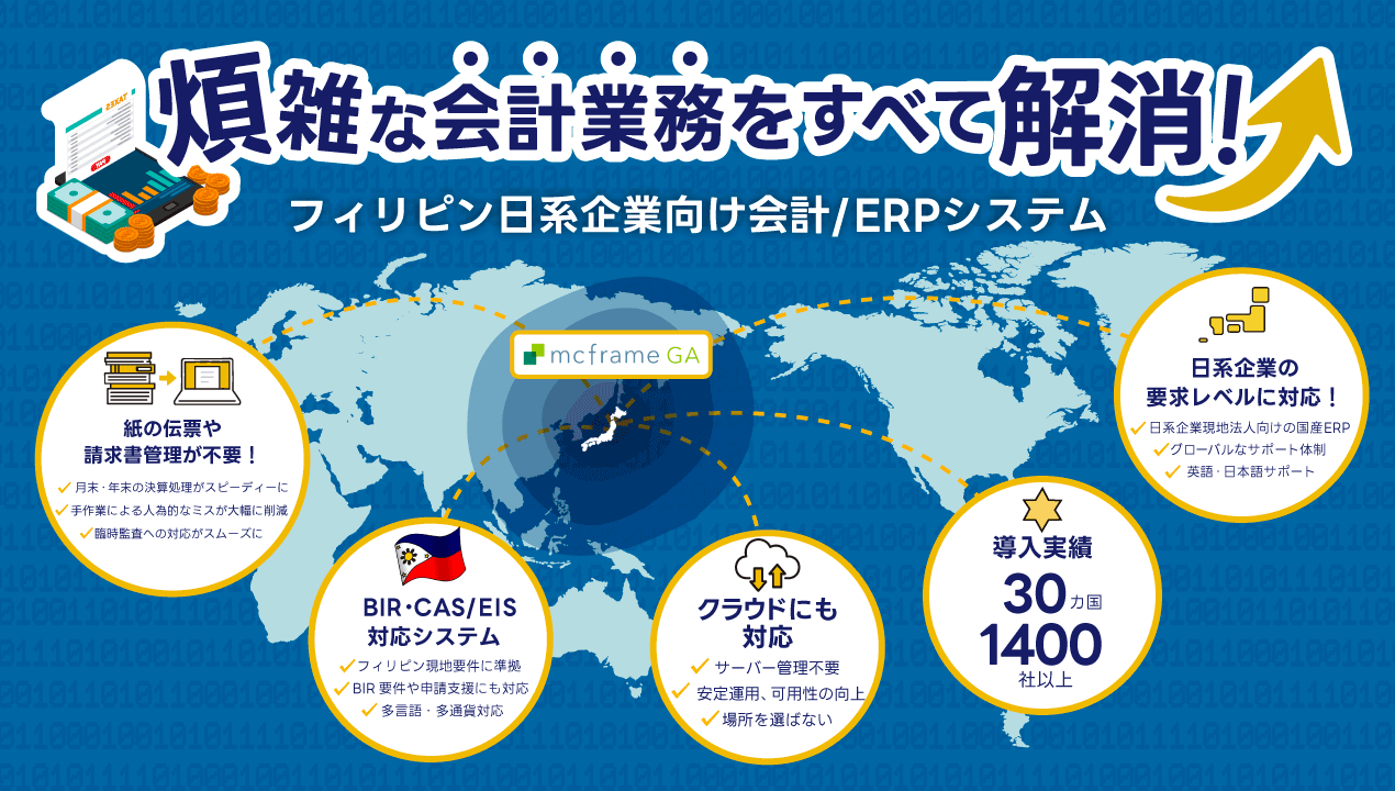 フィリピン日系企業向けに最適化された会計/ERPシステム。販売・購買・在庫・生産管理を統合し、BIR CAS / EIS 対応済み。現地企業と日系企業の双方で採用が進むミドルレンジERP。