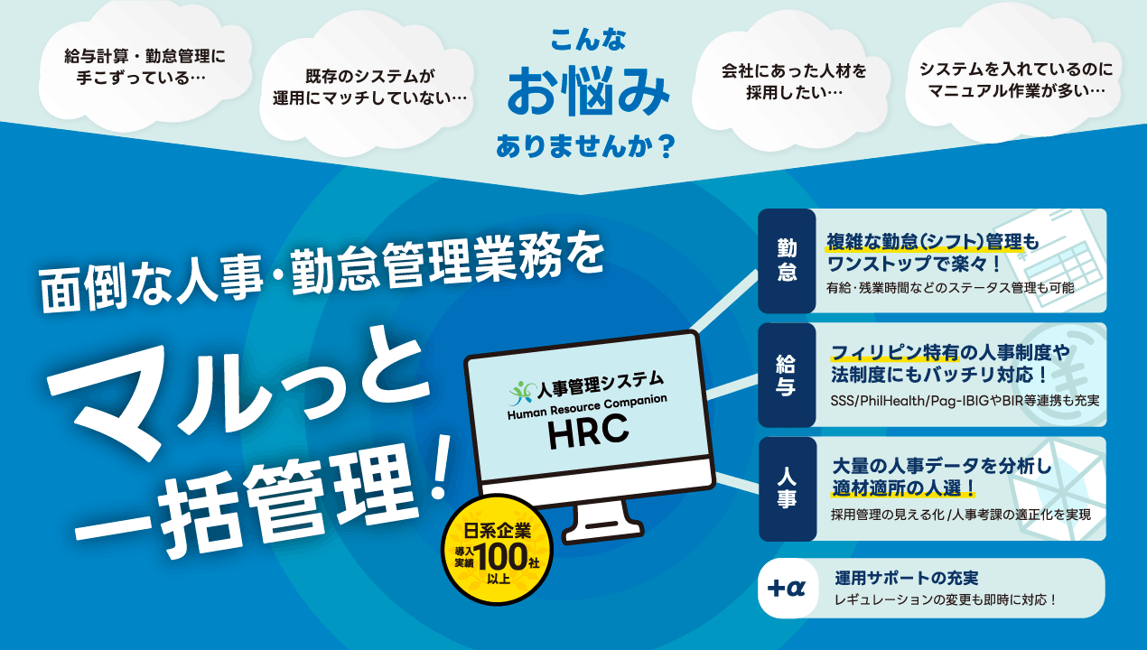 一般的な人事・勤怠・給与に加えて、採用管理・人材管理・スキル管理まで一括管理。複雑なフィリピンの労務規定に対応し、日系企業を中心に多数の導入実績を持つ統合HRソリューション。