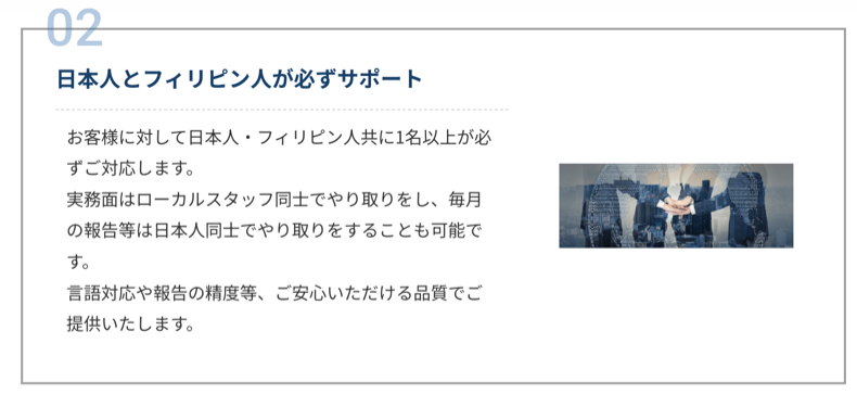 フィリピン進出は簡単なものでは無く、事前調査や準備、柔軟な対応が求められます。日本経営ではフィリピンと日本の両方から、登記手続きだけで無く事業計画等も含めて支援させて頂きます。
