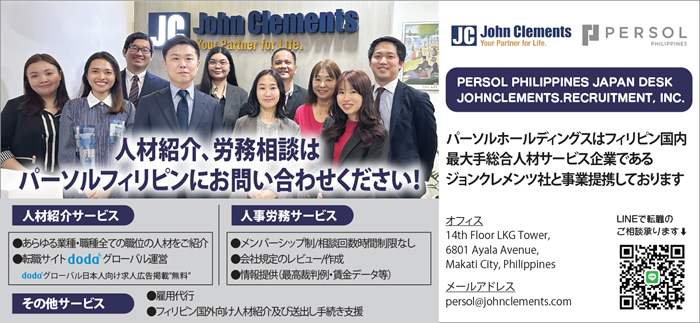 HOME > フィリピンのビジネス > PERSOL PHILIPPINES (JOHNCLEMENTS. RECRUITMENT, INC. – JAPAN DESK) / パーソルフィリピン