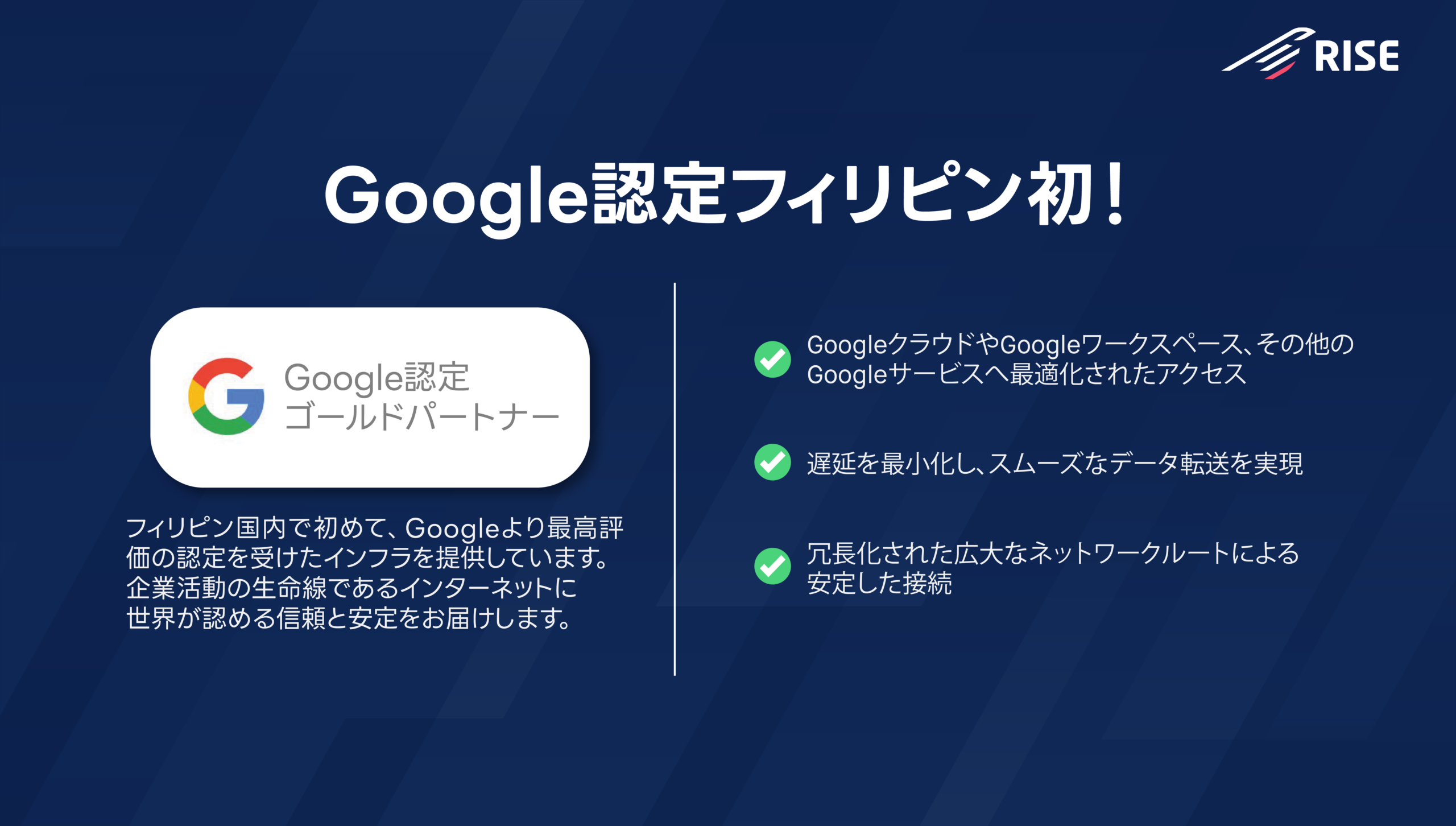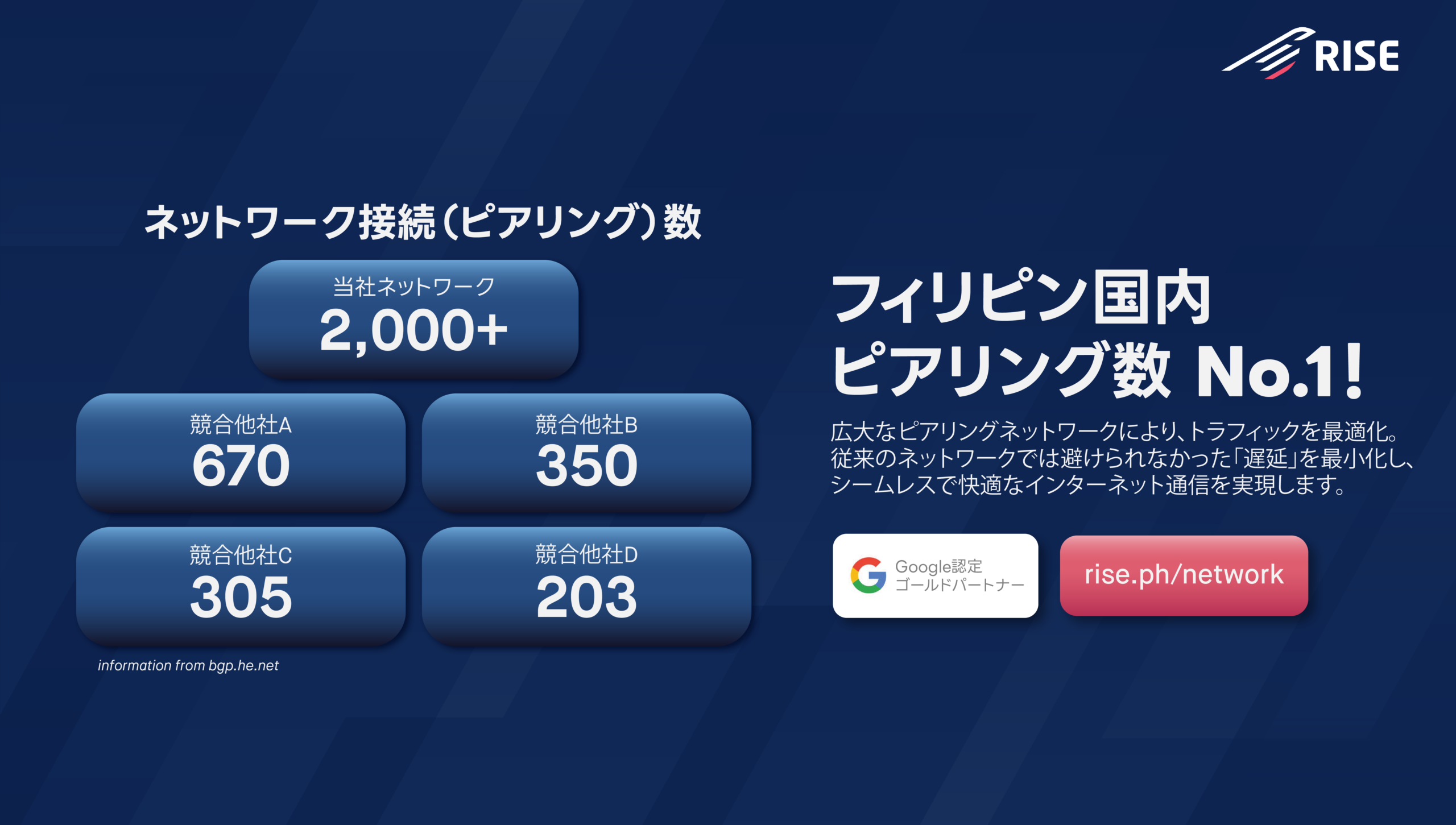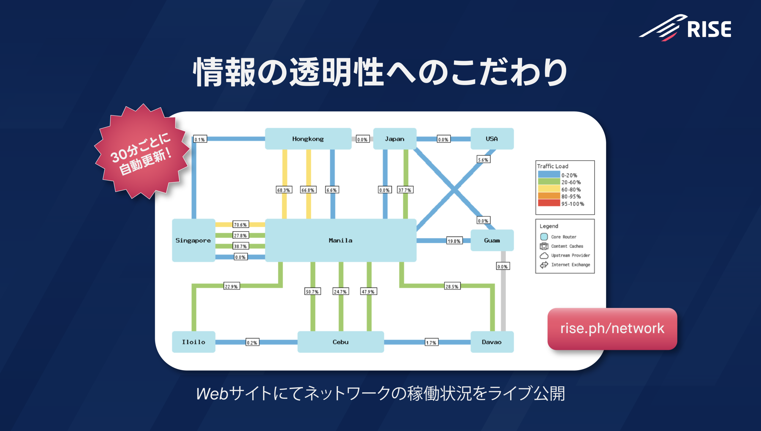 フィリピンの高速インターネットプロバイダー、RISE。独立したビジネスインターネットサービスプロバイダーとして、”フィリピンのインターネットを加速させる” というミッションのもと、高速かつ信頼性の高いビジネスインターネットを提供することで、セブやマニラ首都圏にて多くの多くのお客様にご利用いただいております。
