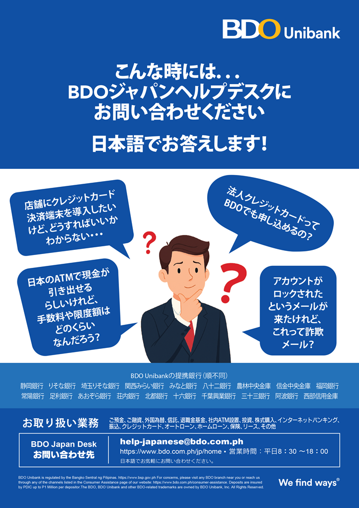 皆様の銀行業務はフィリピン最大の銀行BDOジャパンデスクがお手伝いいたします。