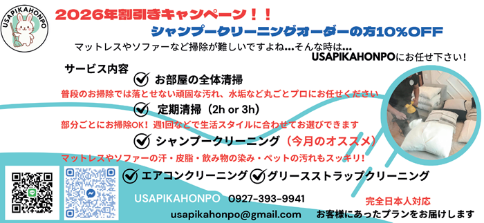 Usapika Honpoマニラで日本クオリティの清掃サービスを提供する「うさぴか本舗」では、12月31日までにご予約の方限定で、ジェネラルクリーニング(お部屋の清掃)が20%OFFになる年末キャンペーンを実施しています。