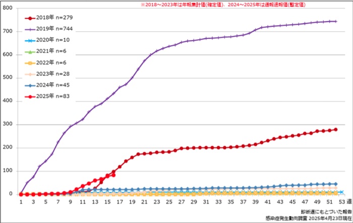 図1、⿇しん累積報告数の推移 2018〜2025年 (第1〜16週)、感染症発生動向調査より抜粋