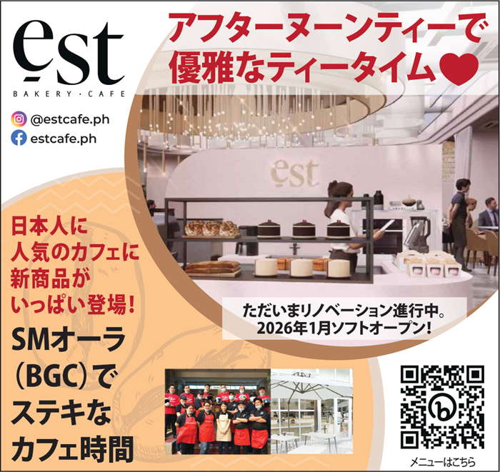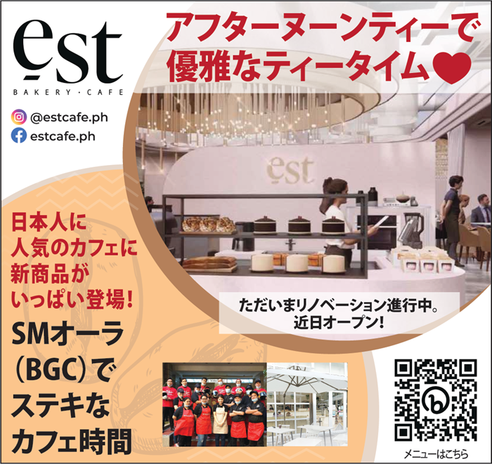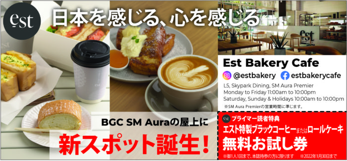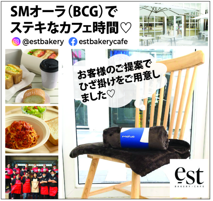 SMオーラに店舗を構えるEst Bakery Cafeは、日本品質にこだわり、店内調理のおいしいパンやケーキ、コーヒーなどを楽しむことができるカフェ。アフタヌーンティーも大好評!ぜひお試しあれ!(2025年10月1日~改装のため休業中です)