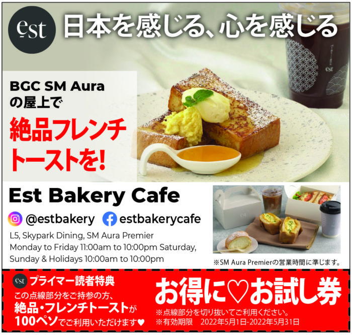 SMオーラに店舗を構えるEst Bakery Cafeは、日本品質にこだわり、店内調理のおいしいパンやケーキ、コーヒーなどを楽しむことができるカフェ。アフタヌーンティーも大好評!ぜひお試しあれ!(2025年10月1日~改装のため休業中です)