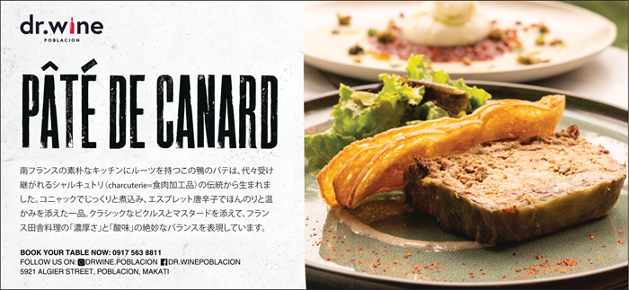 マカティのポブラシオンに構えるカジュアルフレンチビストロ&ワインバー。 世界各地から厳選されたワインを揃え、特にフランス産が豊富。ワインはグラス(P350〜P500)からボトル(P1,200〜P107,000)まで、幅広い価格帯で提供されており、ボトルキープも可能。おすすめ前菜は「Camembert D'Isigny Róti(P1,280)」や「Chicken Liver Mousse with Organic Maple Syrup(P475)」など。