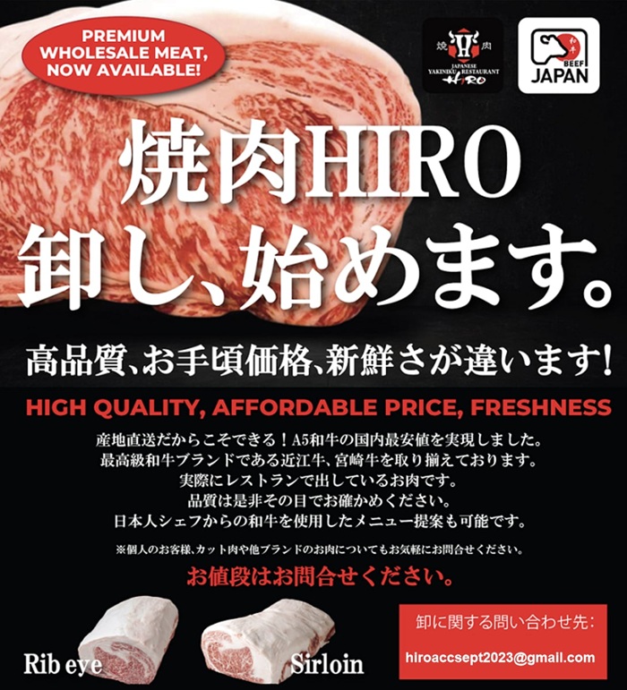 Hiro Japanese Yakiniku Restaurantは、この度、新鮮で高品質な和牛を手頃な価格で皆様にお届け出来るよう、近江牛、宮崎牛を中心に和牛の卸しを開始致しました。お客様に最高の和牛をご提供するために、私たちは常に価格、品質と鮮度にこだわりを持って取り組んでおります。