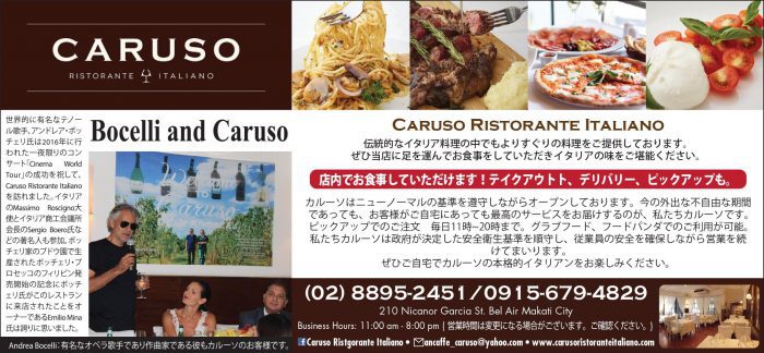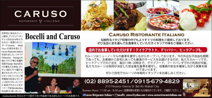 料理、雰囲気ともにマニラで人気を博す本格イタリアンレストラン・カルーソ。パスタやピザ、リゾットや魚料理など、豊富なイタリアンメニューを楽しむことができます。その味を知られた自家製パスタやソースの味を堪能してみましょう。