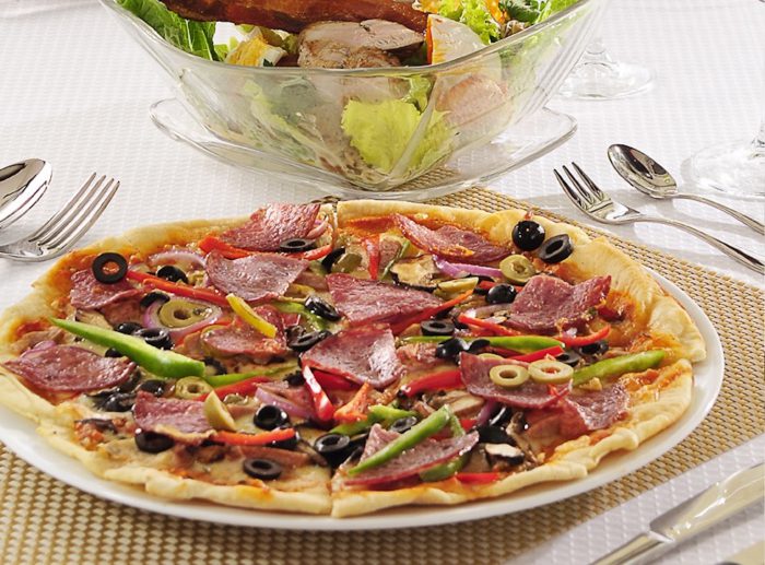 ハムとピーマン、オリーブがたっぷりのPizza Capricciosa(P550)