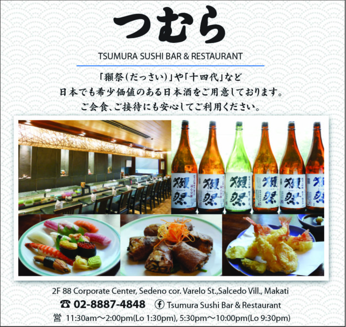 周辺のビジネスマンから信頼の厚い和食店「つむら」。ランチは定食でカジュアルに、夜は個室で接待にと、日本人のツボを押さえた一軒です。出色なのは、豊富なお酒の品揃え。きき酒師でソムリエでもある佐藤マネージャーが厳選した「獺祭(だっさい)」や「百黙」といった珍しい日本酒を置いており、食事にあわせて飲み比べるのも一興。そして「マニラで一番」と自負する寿司。地元で獲れた新鮮な魚介と日本から直輸入したマグロなどを組み合わせ、最高のおいしさを実現しています。