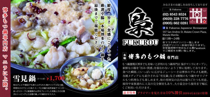 【FUKUROU 梟は閉店しました】もつ鍋激戦区博多でも美味しいと評判のもつ鍋専門店 梟がマニラにオープン。新鮮な小腸を「旨み・質感」を損なわないよう丁寧に処理しております。食べた瞬間、口いっぱいに広がるジューシーさは博多のグルメも絶賛。