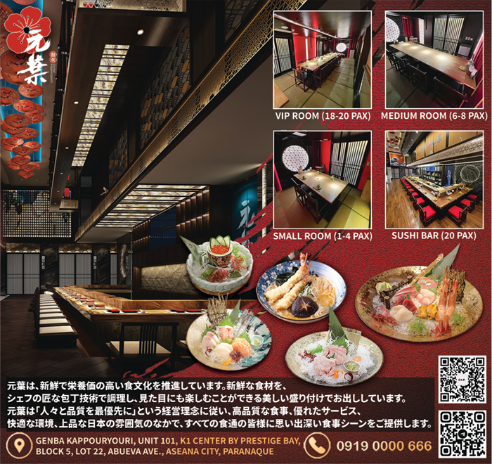 伝統的な日本料理店である「元葉割烹料理」は、オープンキッチンを採用しており、注文した料理が目の前で調理され、シェフの技を堪能することができる。炉端焼き、刺身、寿司がこの店の名物である。元葉割烹料理は、新鮮さ、栄養価の高さ、高級な食文化のみをアピールしている。新鮮な食材、シェフの卓越したカットと調理の技術、そして絶妙な盛り付けを提供する。元葉は日本から高品質の食材を輸入しており、基本的にすべての料理のエッセンスを日本からフィリピンに届けている。山下シェフ自慢の一品は、A5和牛のフォアグラ添え。また、フィリピンの日本食レストランでは珍しい北海道産タラバガニもぜひ試してみてほしい。