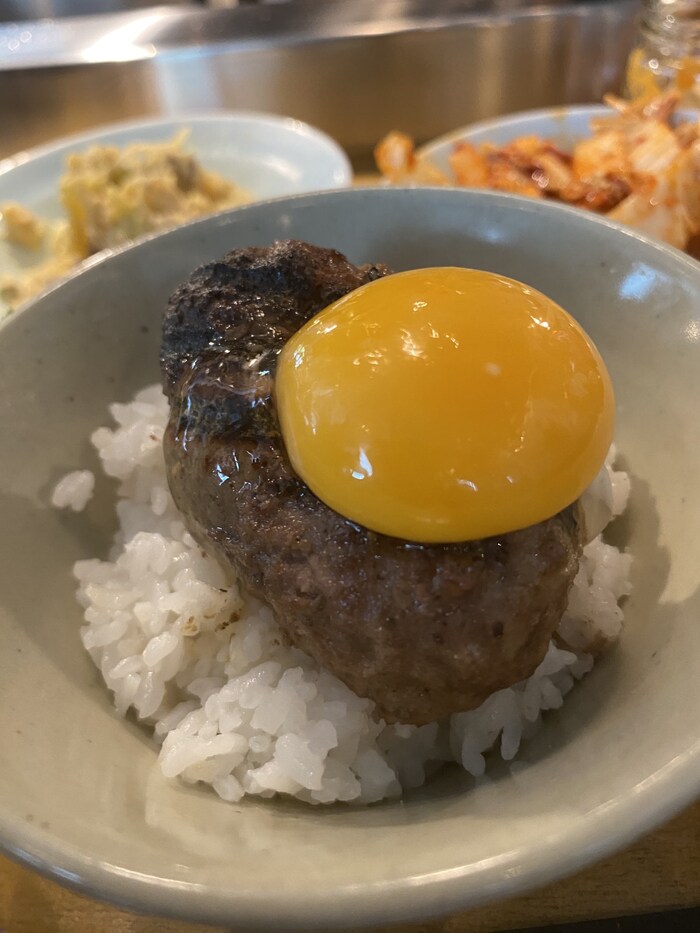 看板メニューは、炊きたてごはんの上に香ばしく焼いたハンバーグを直接のせた「Hikiniku To Come Set」。内容は、90gのハンバーグ3枚に加え、味噌汁、自家製ポン酢、大根おろし、薬味、漬物、生卵と、シンプルながらも満足度の高い一皿。牛肉は毎朝店内で挽き、注文ごとに炭火で丁寧に焼き上げる。ごはんも一日を通して段階的に炊き続け、常にふっくらとした炊きたてが提供されるというこだわりぶり。
