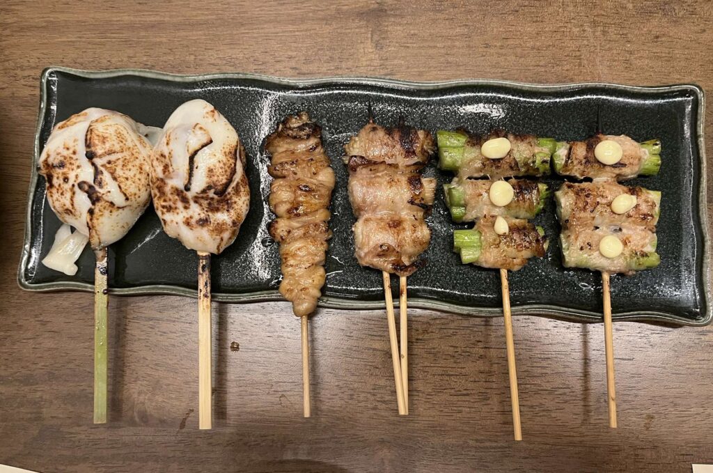 フィリピン店では、焼鳥は「ねぎま」「鶏つくねチーズ」「手羽先」など定番を中心に、1本P120〜170で提供。