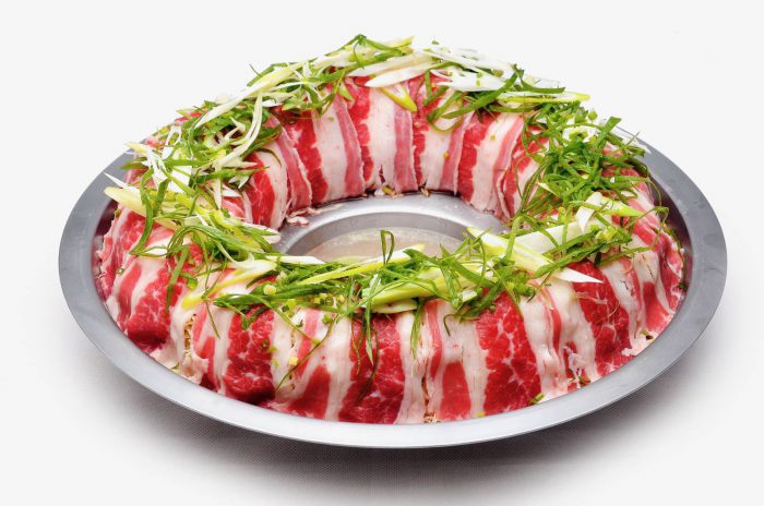 おすすめは、近江牛を使った和牛炊き肉鍋(3~4人前/P2,899)。博多の名物料理で、ドーナツ型の器にキャベツやネギ、薄い肉が並べられている。中心にある牛テールのスープに具を入れて、蕎麦出汁、ポン酢、ゴマダレの3種類のつけダレでいただく。US牛使用の炊き肉鍋(P769)は他支店でも注文可能。