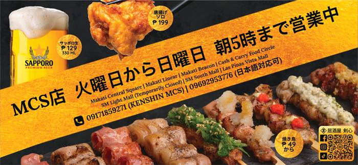 地元フィリピンの皆さまにも大人気の日本食居酒屋「剣心」が、Makati Central Square(MCS)店をリニューアルオープン!正面左側のスペースは、個室エリアに大変身。さらにカウンターも新設され、焼きたての焼き鳥を楽しめるようになりました。 営業時間も拡大し、ランチタイムから深夜5時まで営業!(個室エリアは5pm-12amのみ営業) 家族利用から友人との集まり、さらに深夜の需要にも対応した複合型店舗です。 定番の日本食メニューに加え、自家製生レモンサワーなどドリンク類も大人気。ぜひ新しくなった「剣心」で特別なひとときをお過ごしください!