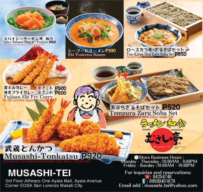 2024年4月22日にOne Ayala Mallにお店「むさし亭」をオープン!おすすめは日本国内で展開する「まるとん本舗」で提供するラーメンにとんかつメニューなど多数揃えています。グロリエッタ店の「むさし丸」では数多くの和食メニューを揃え、とんかつ、ラーメン、寿司、一品物も多数揃えており、日本人にもフィリピン人にも人気店。