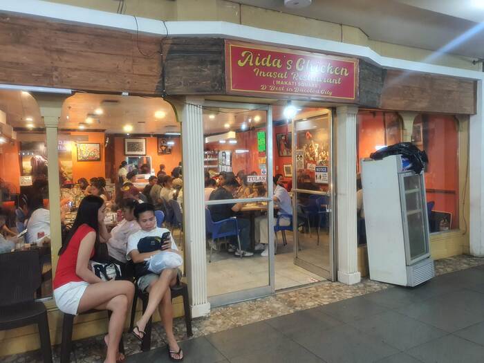 マカティ・セントラルスクエアの地下に店を構えるAida's Chickenは、素朴な佇まいながら長年支持されてきたフィリピン料理店。看板は、注文ごとに焼き上げるバコロド風のチキンイナサルで、香ばしい燻香とジューシーな仕上がりが魅力だ。