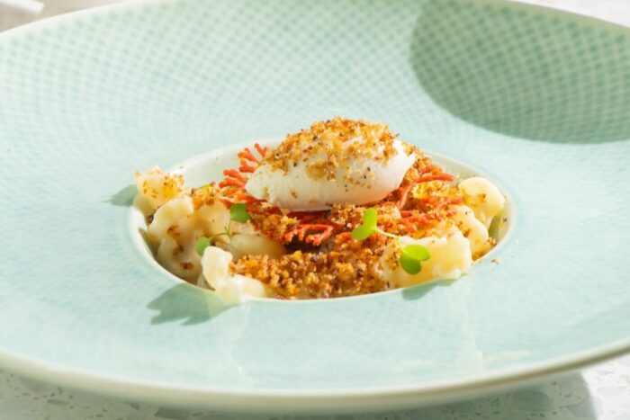異なる2つの文化を融合したパスタ料理「Cacio e Pepe」は、ボラッチョチーズ、ココナッツクリーム、トゥヨ(フィリピンの干物)のフレーク、そしてパルミジャーノジェラートを重ねた一皿である。温度と食感のコントラストが巧みに操られており、一口の中で温かさと冷たさが同時に広がるのが特徴だ。誰もが知るパスタにフィリピンの日常的な食材を掛け合わせることで、驚きのある新しいバランスを生み出している。