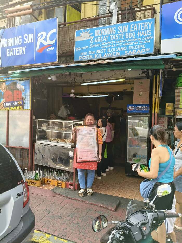ケソン市J.P.リサール通り沿いに店を構えるMorning Sun Eateryは、1990年代から親しまれてきたイロカノ料理のカリンデリア。創業者のElizabeth “Nanay Beth” Mortera氏と娘のLyn氏が切り盛りし、素朴で誠実な家庭料理を今も変わらぬ価格で提供している。店内はトゥロトゥロ形式で、並んだ料理から選ぶ昔ながらのスタイル。名物は、酸味と燻香が効いた「Dinakdakan(P90)」、香ばしく焼いた豚バラ肉の「Liempo(P250)」、酢の風味が食欲をそそる「Pork Kilawen(P90)」。気取らない味わいに、地域の食文化が息づく一軒だ。