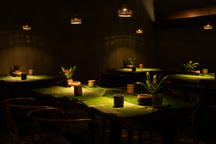 父親が建てたバハイ・クボ様式の小屋をメインダイニングとし、元ジムだったキッチンで11~16品のテイスティングコースを提供する。