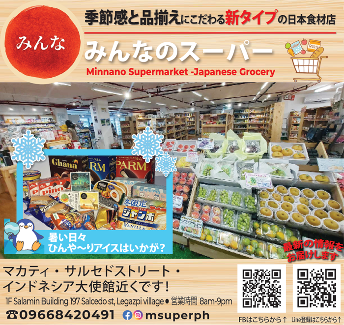 マカティのサルセドストリート、インドネシア大使館近くに店舗を構えるみんなのスーパーは、季節感と品揃えにこだわる新タイプの日本食材店。店内は木目調の棚に商品がきれいに陳列され、シンプルで上品な印象で、日本のスーパーに売っているお馴染みの食品が手に入る。冷凍食品、レトルト食品、インスタント食品や調味料などの他、産地直送の新鮮な野菜や果物も人気だ。
