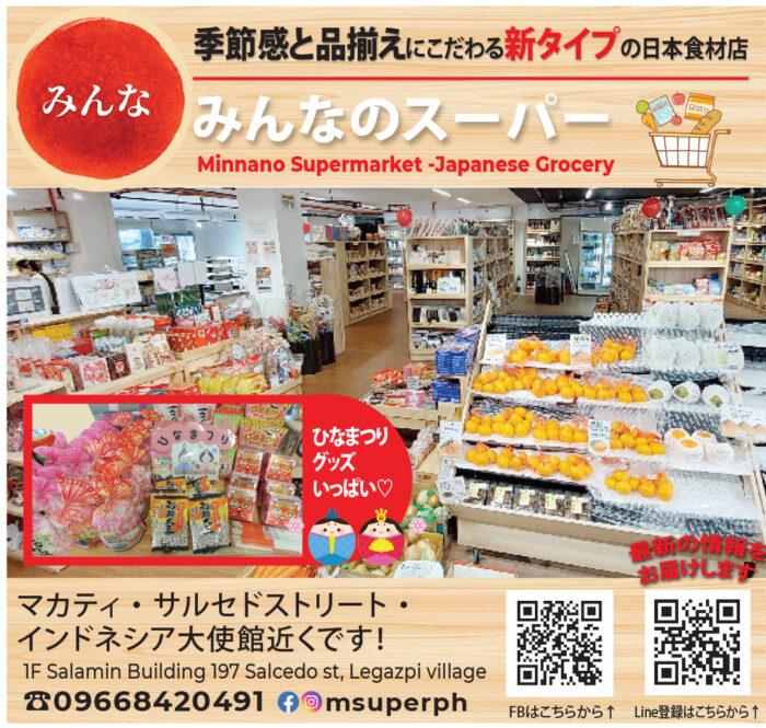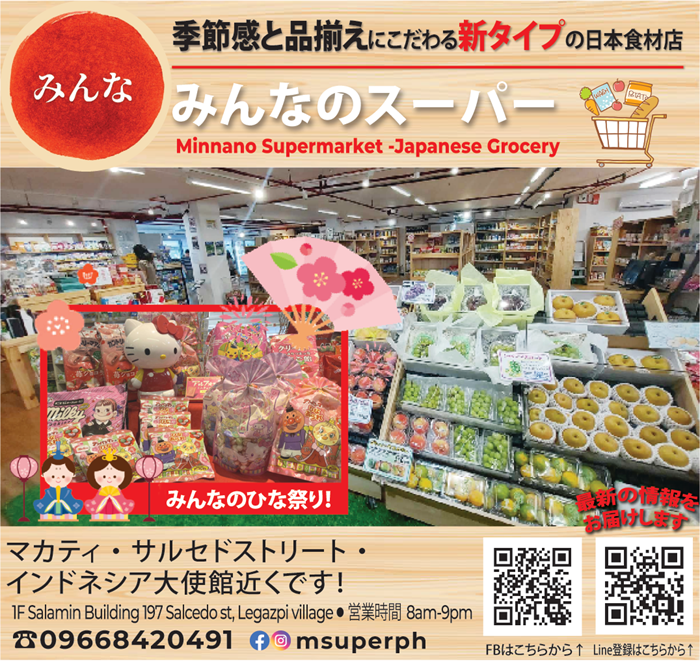 マカティのサルセドストリート、インドネシア大使館近くに店舗を構えるみんなのスーパーは、季節感と品揃えにこだわる新タイプの日本食材店。店内は木目調の棚に商品がきれいに陳列され、シンプルで上品な印象で、日本のスーパーに売っているお馴染みの食品が手に入る。冷凍食品、レトルト食品、インスタント食品や調味料などの他、産地直送の新鮮な野菜や果物も人気だ。