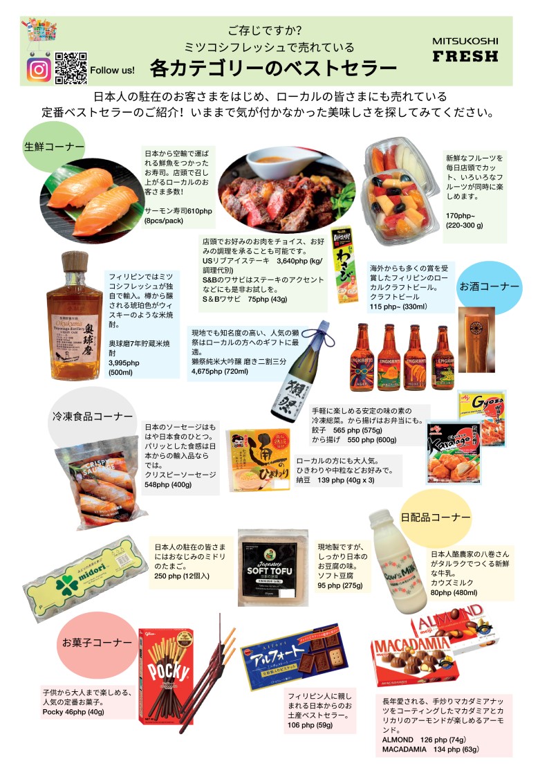 パティスリー・べべルージュやイコマイなど、フィリピンに拠点を置く日系のお店の商品も取り扱う。また、マグロの解体ショーなどのイベントも開催される。