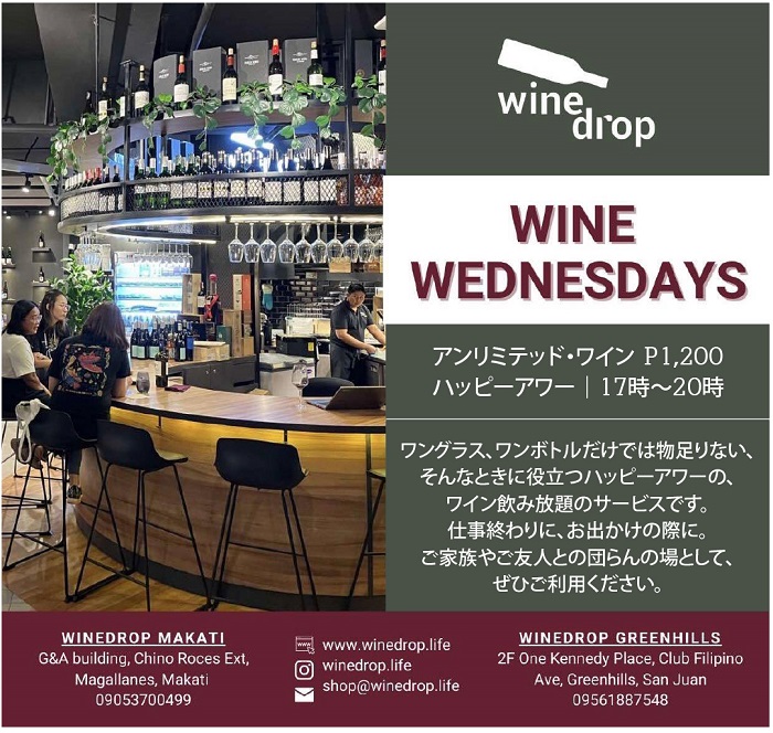 Winedropは、マカティ市に店舗を構える、快適で親しみやすく、居心地の良い雰囲気のワインショップ。生産地と同じようにワインを楽しんでもらいたいという思いから、冷凍コンテナでワインを輸入、温度管理された施設で保管を徹底し、最高品質のワインをお客様に提供している。