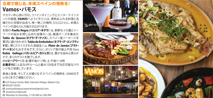 マカティのサルセドのPaseo centerのVamosでは、本場スペインの本格料理とともに、迫力あるフラメンコパフォーマンスや息をのむエアリアルダンスをご堪能いただけます。
