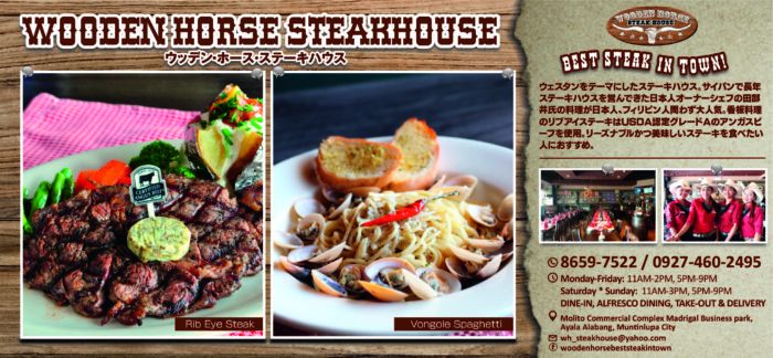 Molitoに構える、ウェスタンをテーマにしたステーキハウス。サイパンで長年ステーキハウスを営んできた日本人オーナーシェフの田部井氏の料理が日本人、フィリピン人問わず大人気。看板料理のリブアイスステーキはUSDA認定グレードAのアンガスビーフを使用。P1,000以下のリーズナブルなステーキも提供しており、気軽にステーキを食べたい時におすすめ。ステーキ以外のメニューも豊富で、日本食のメニューも提供。フレンドリーなスタッフとアットホームな雰囲気で地元民に愛されるステーキ店だ。
